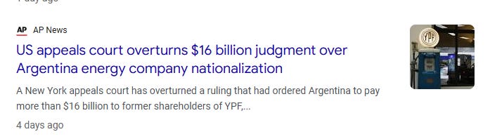 Argentina literally stole and nationalized private investor assets and lost a $16 billion dollar ruling but since Trump and Milei are bros it’s highly likely the judiciary was influenced to overturn this.