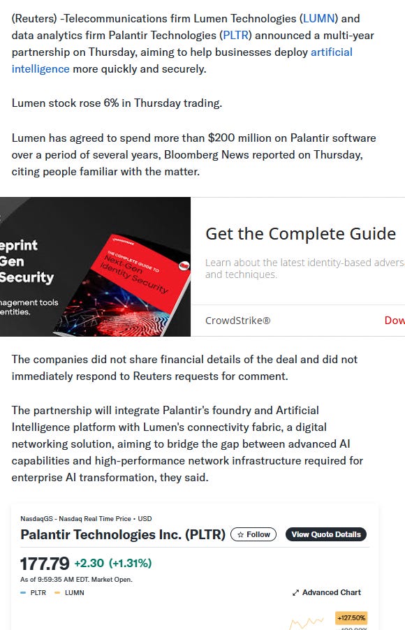 Then along came Alex Karp of Palantir, the philosopher-king of data analytics, sliding into the picture just as Lumen’s stock cratered to around $4. He didn’t see a broken company; he saw railroads in waiting.