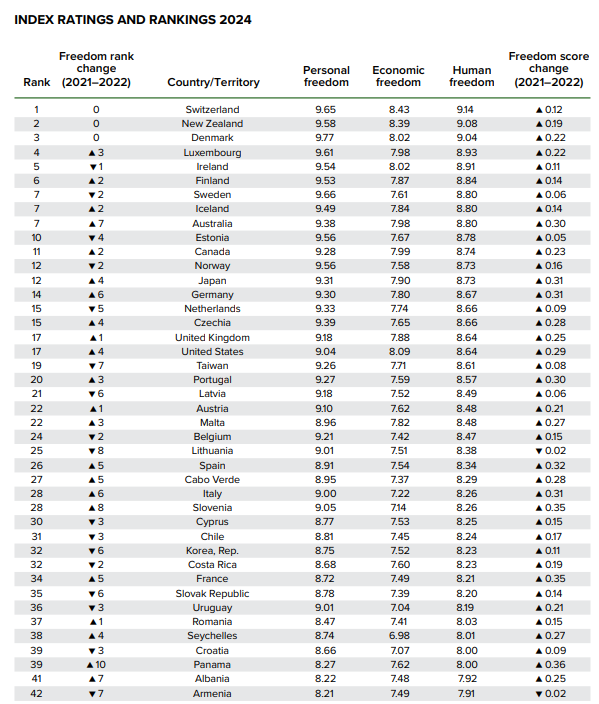Now lets look at the latest rankings of countries by Cato Institute: