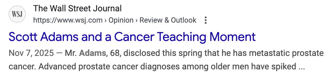 The famous cartoonist behind Dilbert, who also built a fantastic daily livestream for a decade, is now showing up to work visibly sick from cancer. He’s in a lot of pain. He still tries to deliver humor and affection. But he needs proper treatment.