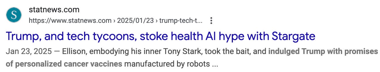 Larry Ellison, always amongst the wealthiest individuals on the planet, literally stood in front of the President and told the country that AI + biotech will find cures for YOUR specific needs at a fraction of the cost.