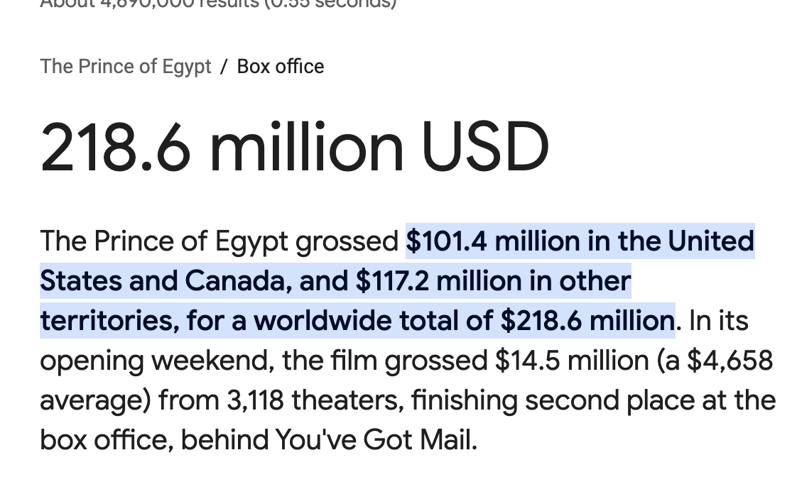 Prince of Egypt produced by Dreamworks ( Spielberg and Katzenberg’s great way to usher in their animation studio)