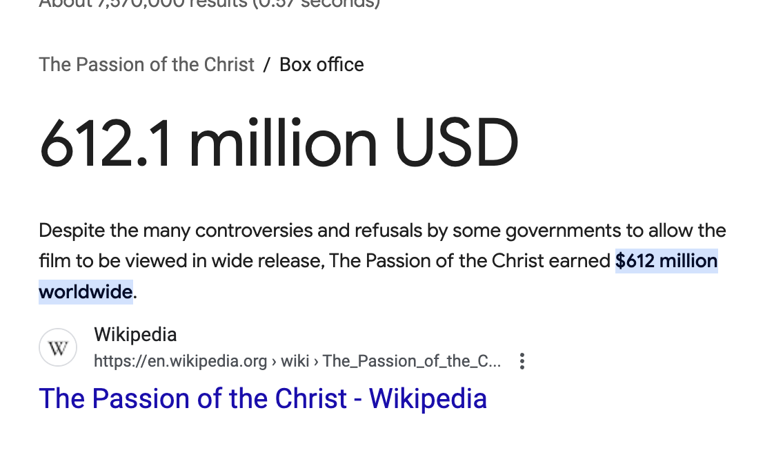 And lets throw in the story of Jesus to see its Box Office, the Passion of Christ as filmed by Mel Gibson